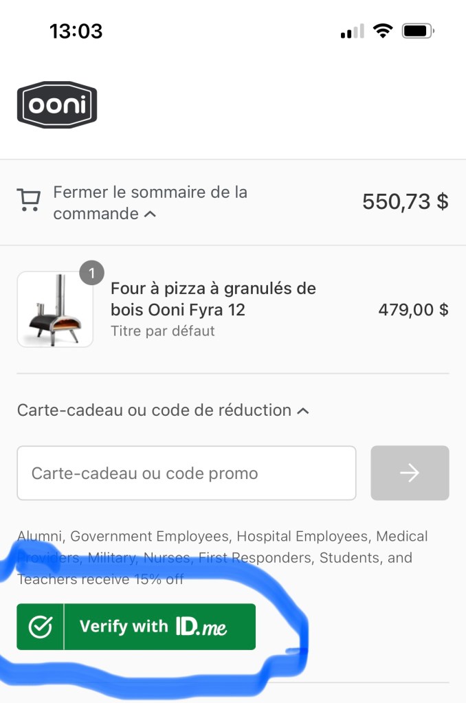 3: sélectionner ce que vous voulez acheter et au moment de payer aller dans coupon et discount et vous allez voir iD.me en vert cliquez dessus, sélectionner militaire et voilà vous avez votre rabais