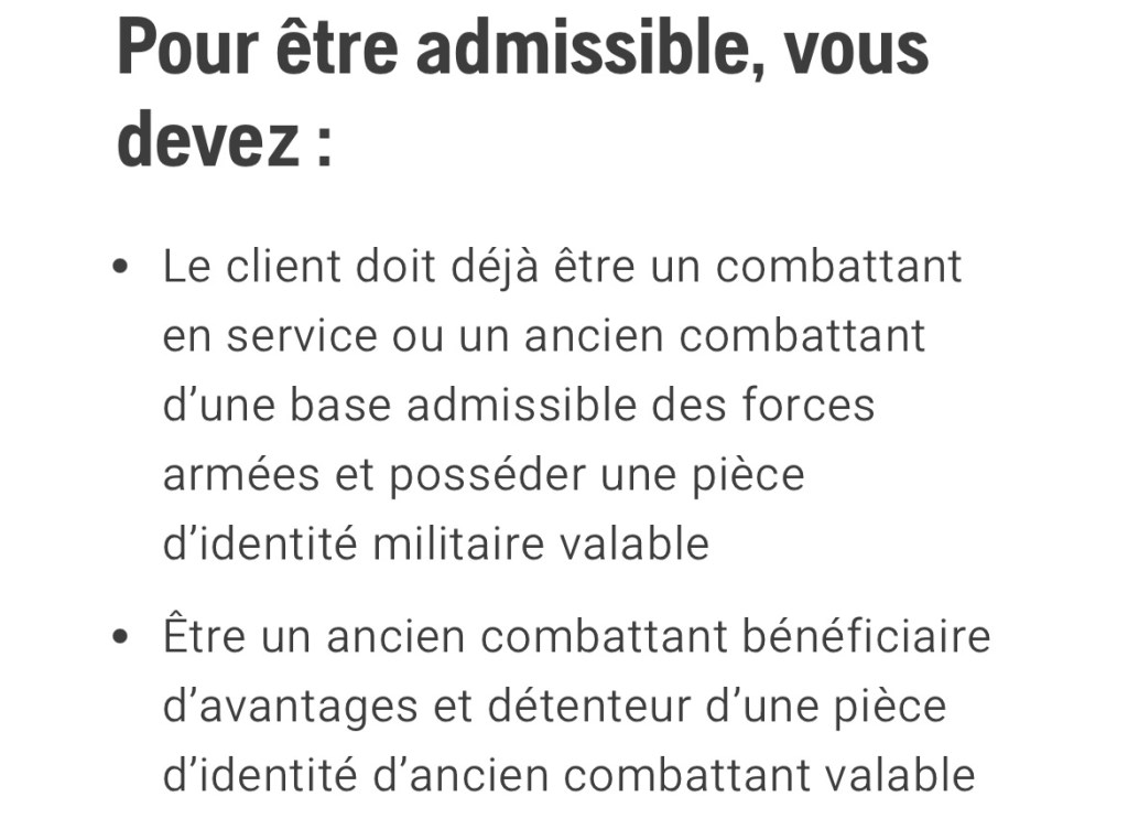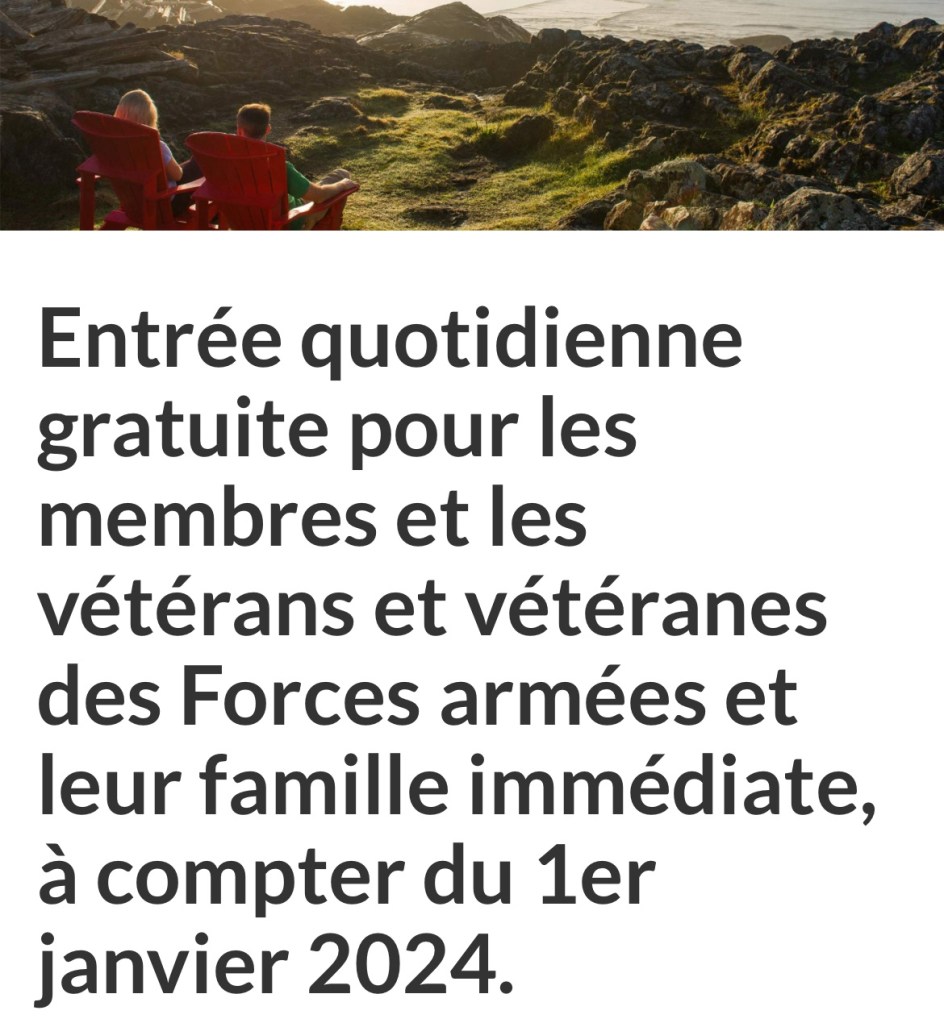 Conditions : Applicable aux vétérans et membres actifs des FAC sur présentation d’une carte d’identité militaire ou de vétéran.