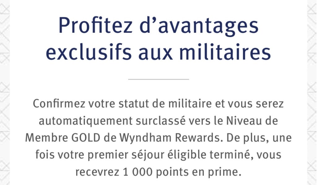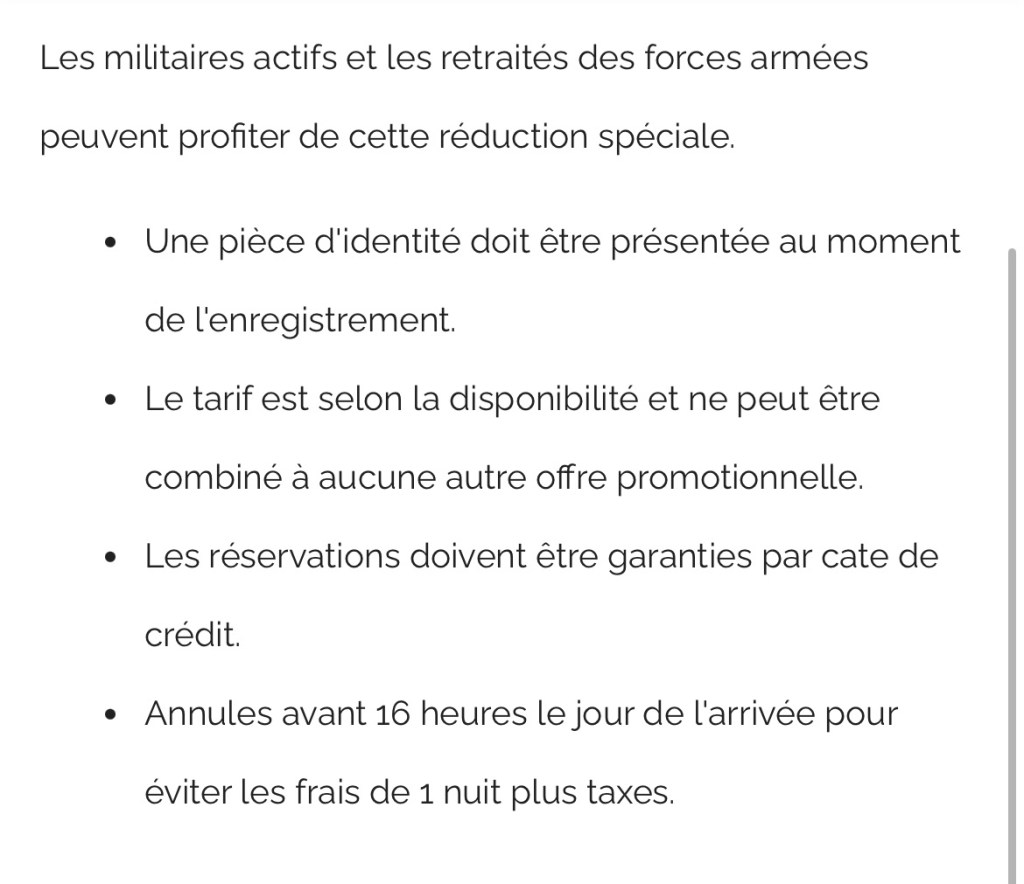 30 % de réduction sur le tarif hôtelier le plus bas pour les militaires et vétérans américains et canadiens